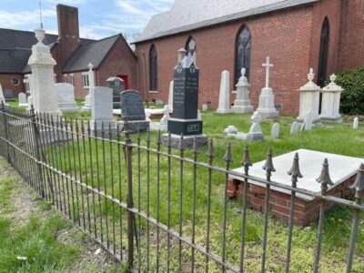 The two lots that the church was to be built on would also include burial lots on either side of the church and between the church and Harris Alley. A fence was to be installed around the cemetery with a gaited entrance to the church. Unfortunately due to financial constraints only a small amount of the fence was built. The iron fence that exists today is that fence. In addition to the first cemetery layout five additional sections of the cemetery were created in 1987 on the fourth lot next to Front and E. Pine Streets. Cemetery records were poorly kept. The first thing that had to be done was break the lots up into sections with lot numbers. Father Stokes in the beginning of his retirement began putting names to the lot numbers for each section. In addition to his efforts, Douglas Myers, the son of Danny and Ruth Myers of Boy Scout Troop 99 approached the vestry in 2012 requesting permission to clean the memorial stones. He was interested in using this as part of his Eagle Scout designation.